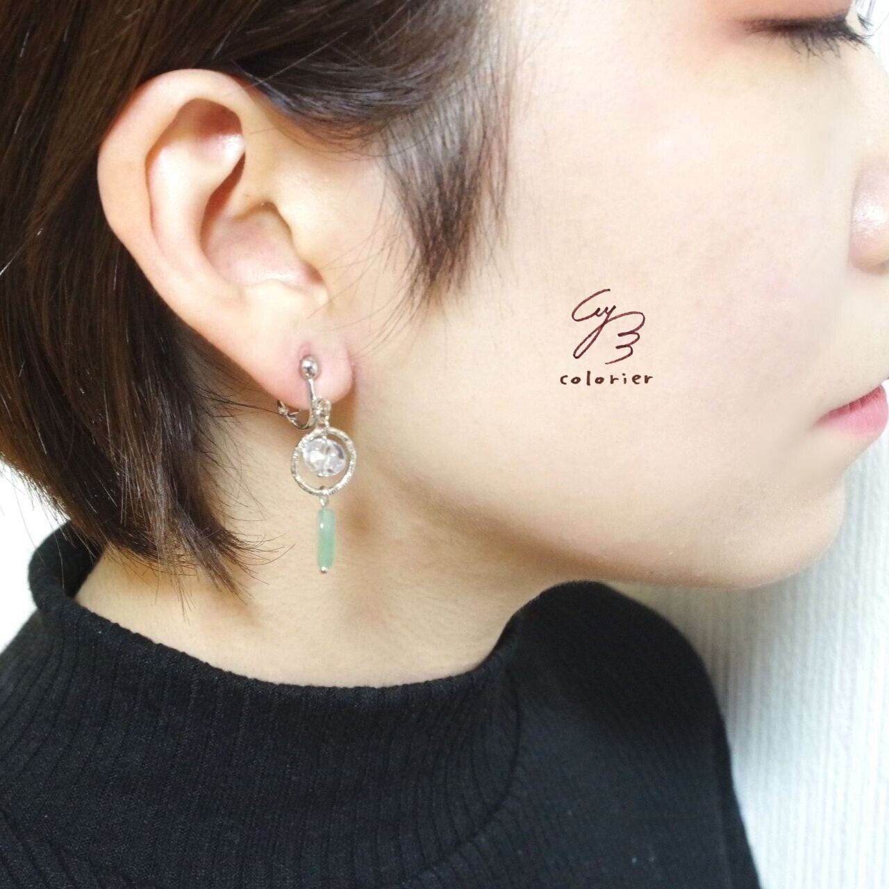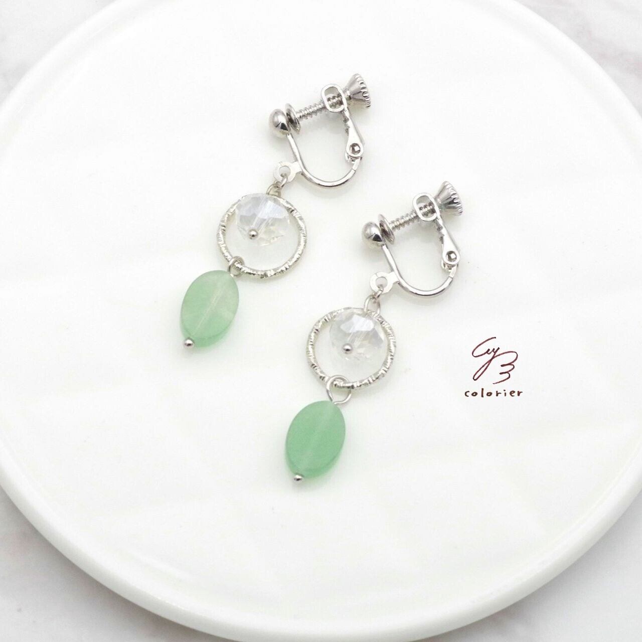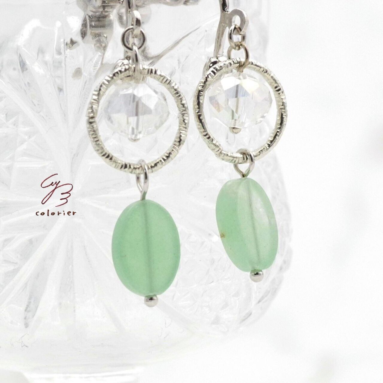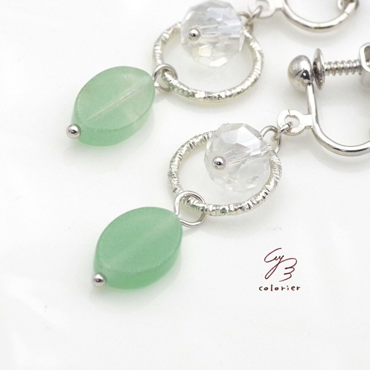 グリーンアベンチュリンという天然石と、カットのきらめきが美しいガラスビーズを使った耳飾りです。