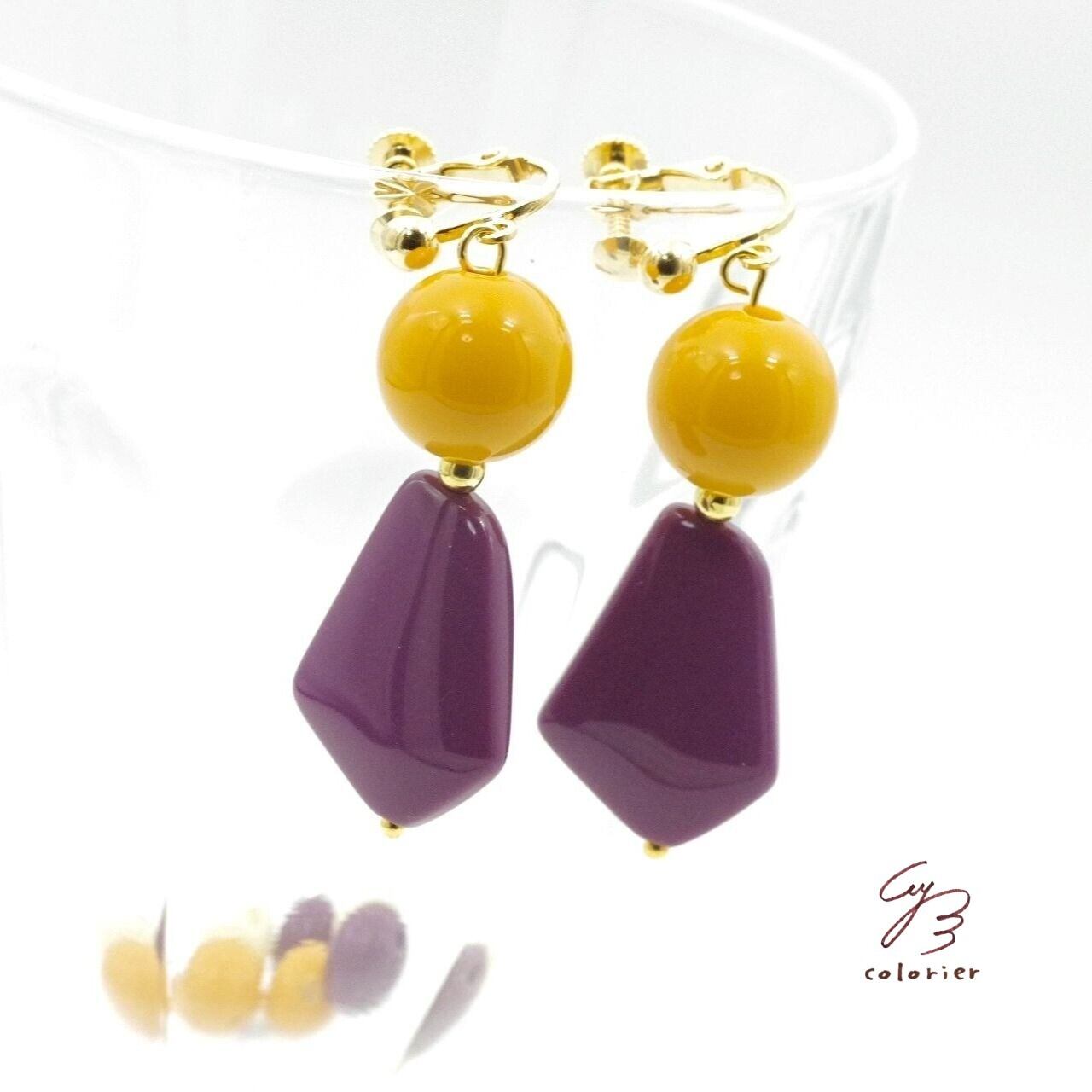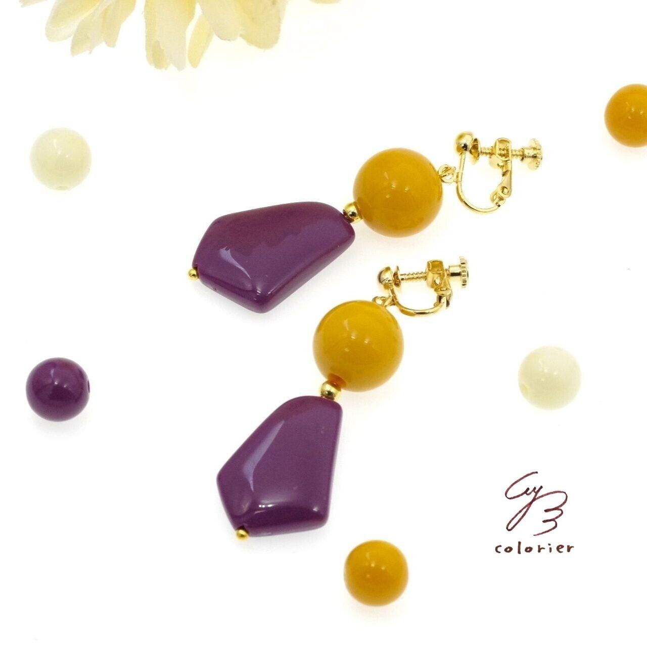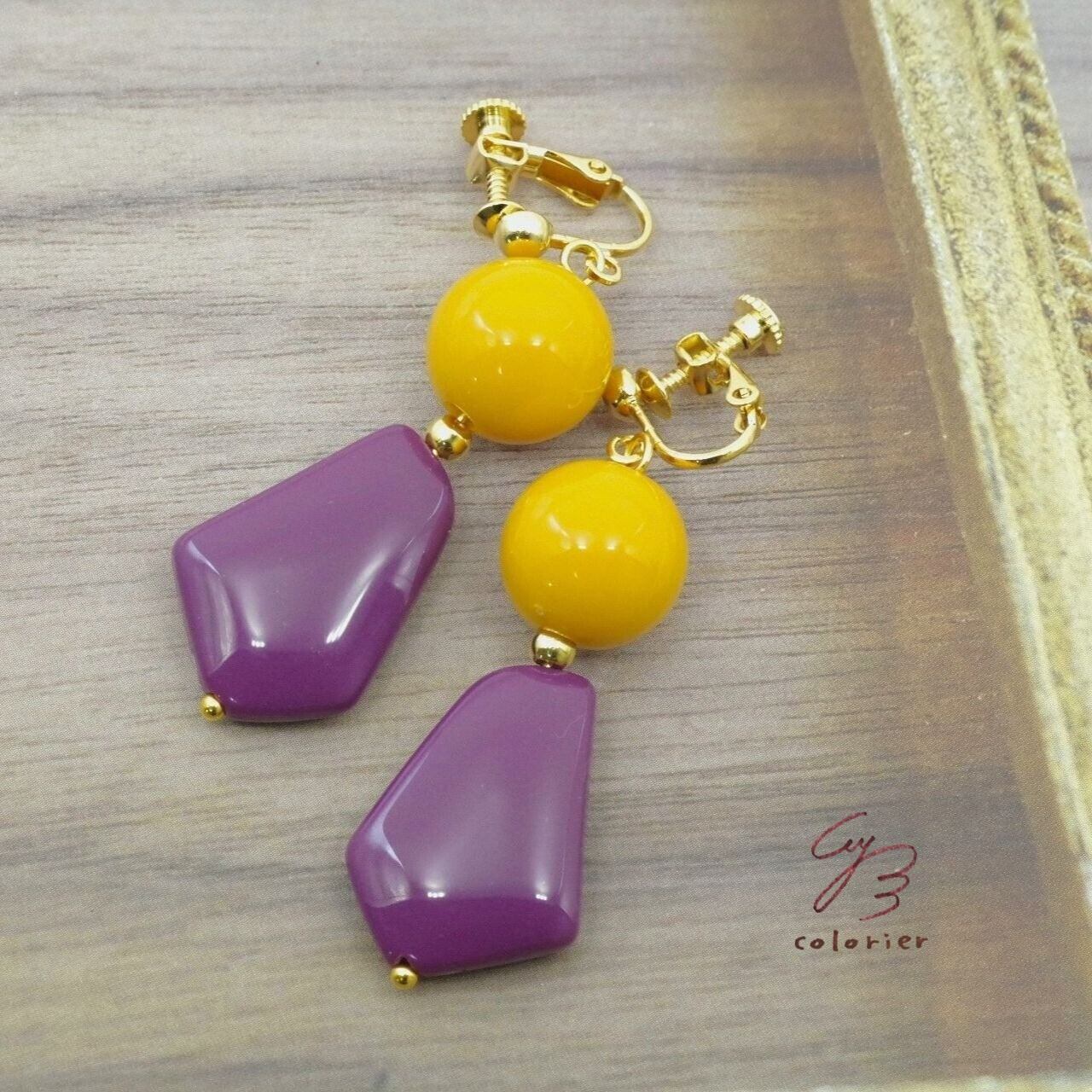 Colors 大振りレトロなイヤリング パープル×マスタード
