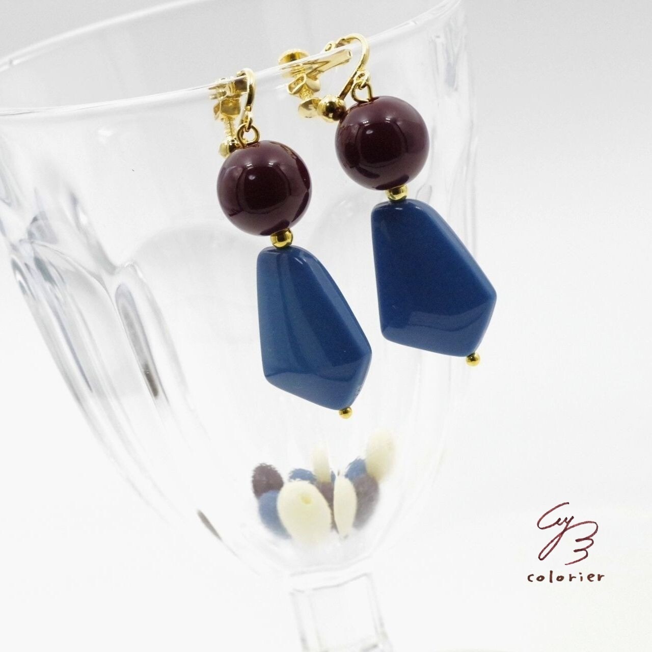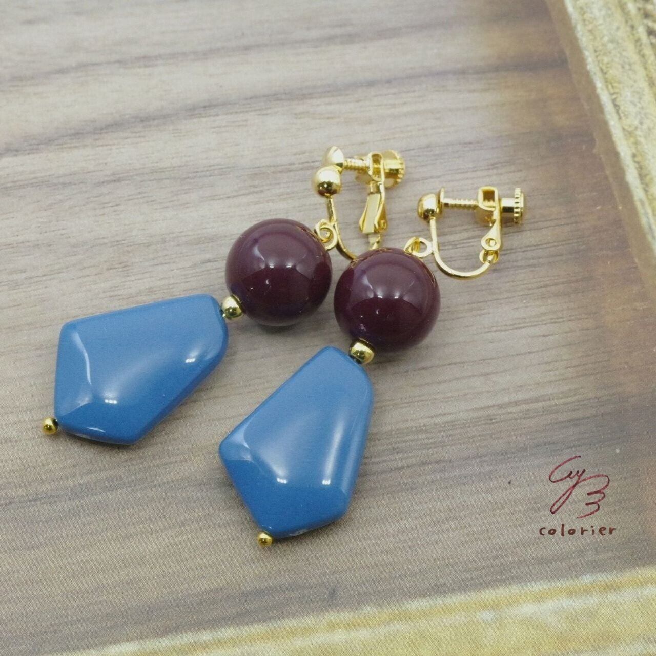 Colors 大振りレトロなイヤリング ブルー×ボルドー